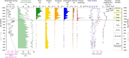 长江下游很早就有人类文明的出现和水稻的驯化历史,由于材料的缺失目前研究还是很局限。本研究选取浙江雁荡山龙宫湖,基于人类活动产生的炭屑和谷物水稻花粉以及人类相关的生物指标开展研究。公元前890年到公元850年,研究区周围以常绿阔叶林为主;公元850年之后明显常绿阔叶林开始减少,同时谷物类植物开始种植且砍伐树木也逐渐频发,这个时期到了唐朝(公元618-907年)特别显著;而宋朝(公元960-1279年)该地区大规模的战争和人们对土地的争夺造成山区森林锐减同时火灾频发。同时我们的植物多样性研究也为当地的次生林发展提供科学基础。