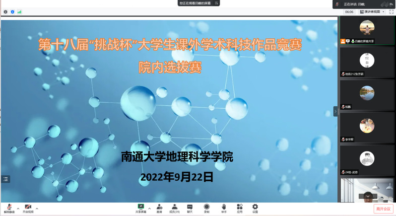 9月22日下午,地理科学学院举办第十八届“挑战杯”全国大学生课外学术科技作品竞赛学院选拔赛。院党委副书记兼副院长龚一文、钱鹏教授、董进国教授、院党委委员叶磊及学工办主任李宇辉受邀担任本次选拔赛评审专家