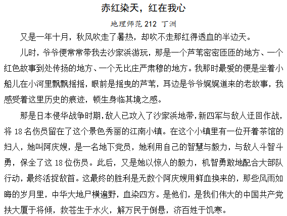 比赛引起了全院同学的广泛关注,最终共有21篇参赛作品进入终评环节。经过评委公开、公平、公正的评审,地理师范211班丁洲同学以《赤红染天,红在我心》摘得桂冠,理师范211班胡庭韵地理师范212班董星辰同学分别以作品《青春应在奉献中焕发绚丽光彩玻璃晴朗,橘子辉煌喜获二等奖,理师范211班胡星宇地理师范211班张梦茁、地理信息201班姬文翔等3名同学喜获三等奖,另有4篇作品跻身比赛优胜奖行列。