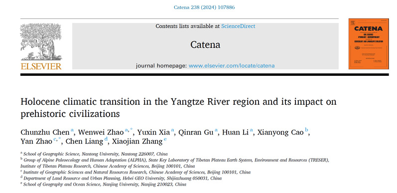 近日,sunbet申搏官方网站陈春珠副教授为第一作者、sunbet申搏官方网站为第一单位,在国际知名学术期刊《Catena(链)》(中科院分区一区TOP期刊,影响因子6.2)上发表题为“Holocene climatic transition in the Yangtze River region and its impact on prehistoric civilizations(长江流域全新世气候转变及其对史前文明的影响)”的学术论文。