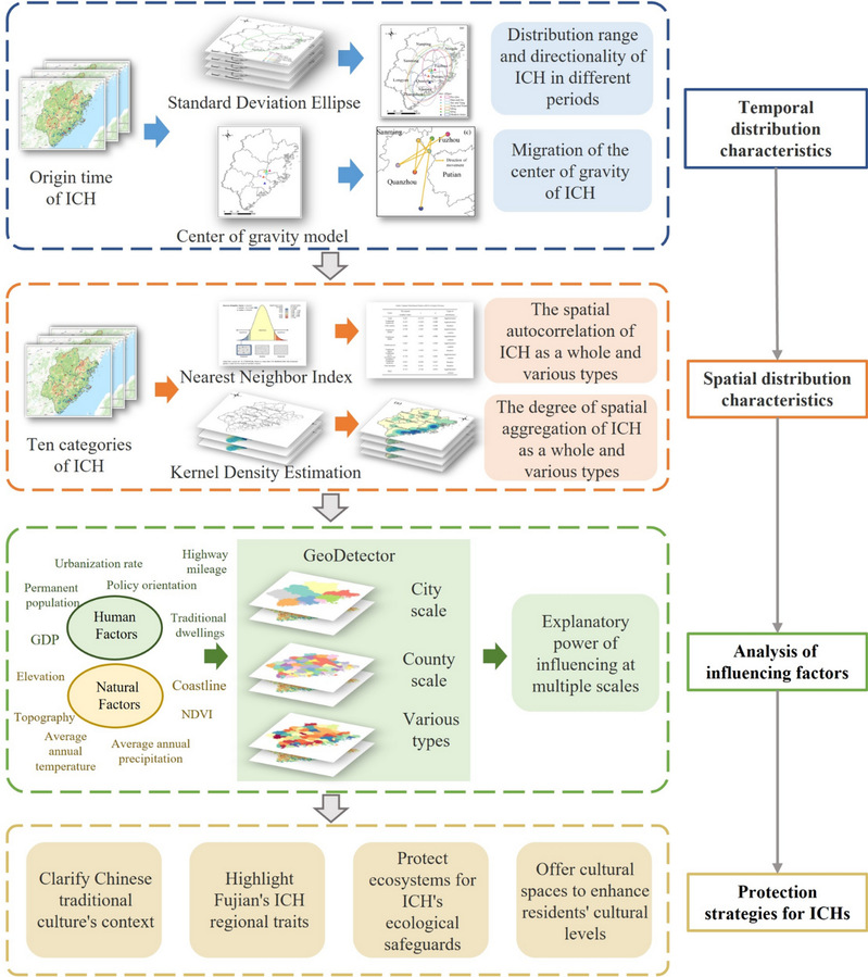 非遗空间格局的宏观把控和影响因素挖掘有助于非遗保护和传承。本文从地理空间视角出发,以福建省的五批国家级和六批省级非遗为研究样本,以市级、县级和民居分区为分析单元,采用重心迁移模型和地理探测器等方法,分析了非遗的时空分布特征及其影响因素。时间视角上,先秦至近代时期福建非遗分布重心的移动轨迹呈现“南北往复,整体向南”。空间视角上,福建省非遗整体呈现聚集模式,但传统技艺类等密集区分布于沿海地区,传统舞蹈类等零散分布于闽西北地区。采用地理探测器,分别从整体和类别探明了福建非遗的主导影响因素。研究结论有助于相似地区非遗体系化保护和文化产业开发,同时丰富了非遗时空分布挖掘的研究方法体系。