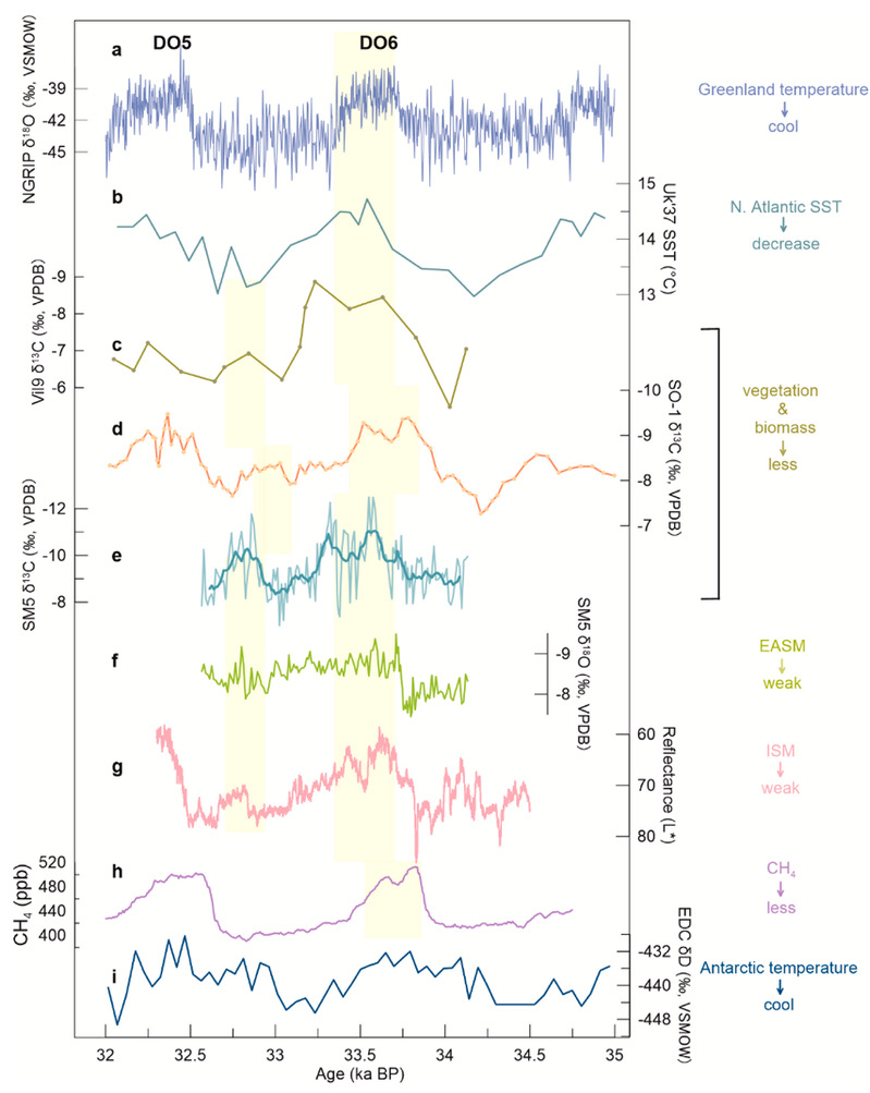 Dansgaard-OeschgerDO)事件是末次冰期(约11万至1.2万年前)北大西洋地区频繁发生的千年尺度快速气候振荡事件,其温暖间冰阶(Interstadial)与寒冷冰阶(Stadial)的交替发生对全球气候系统产生深远影响。本研究基于湖南石马洞石笋SM5的高精度铀系测年(7230Th年龄)和144组稳定同位素数据(平均分辨率12年),重建了3.413.26万年前东亚夏季风演化历史,结合亚洲、南美洲8支石笋记录框定了DO6事件的起止时间与持续时间,验证了格陵兰冰芯GICC05时标在这一时段的可靠性。