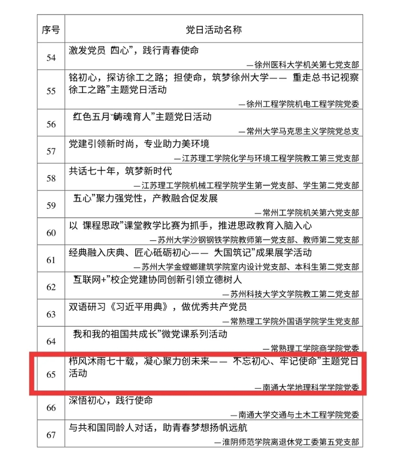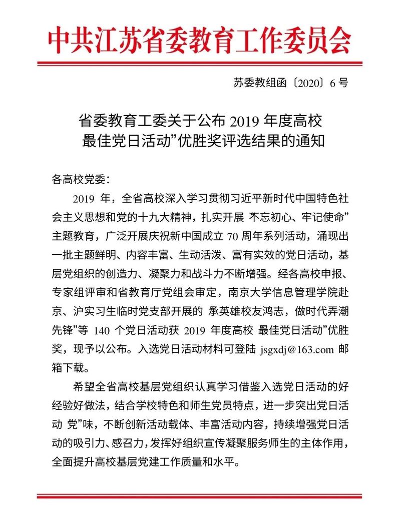 近日,江苏省委教育工委公布了2019 年度全省高校 “最佳党日活动”优胜奖评选结果,全省高校共有140个党日活动获得表彰,sunbet申搏党委开展的《 “栉风沐雨七十载,凝心聚力创未来”——“不忘初心、牢记使命”主题党日活动》榜上有名。